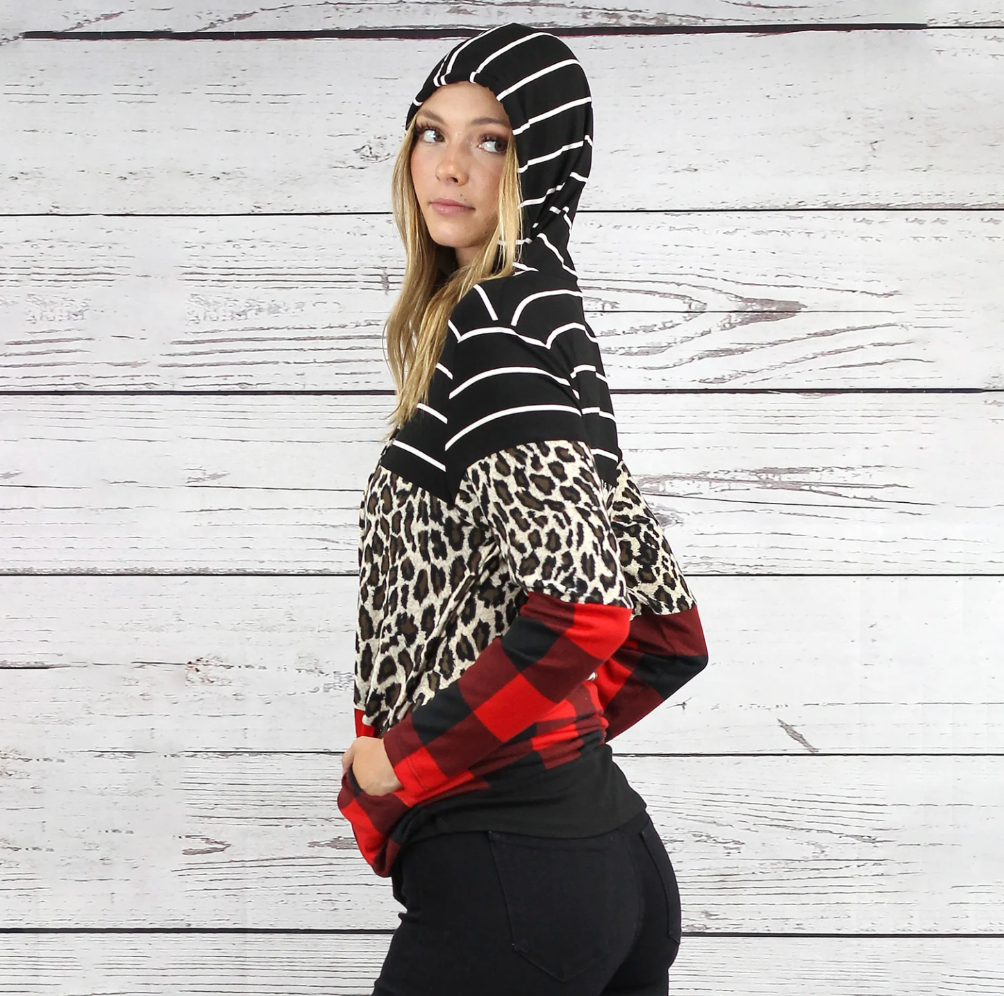 Buffalo Plaid, Leopard, & Stripes Hoodie-Blk