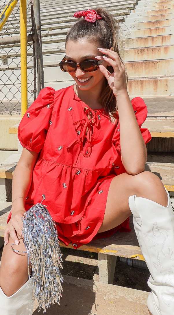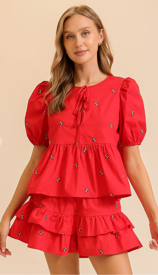 Celebrate game day in style with our Football Patch Top, crafted for passionate fans. Featuring a flattering peplum hem and charming puffed sleeves, this top adds a playful, sporty touch to your outfit. Available in multiple colors, it’s perfect for showing off your team spirit while staying comfortable and chic. Elevate your fan wardrobe with this must-have piece that combines fun details and flattering design effortlessly.
