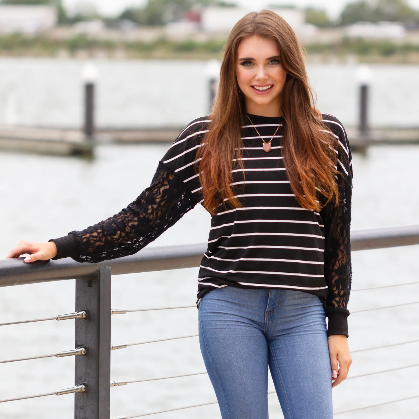 Elevate your wardrobe with this stunning striped top featuring delicate lace sleeves that blend classic style with modern sophistication. Crafted from a premium fabric blend of 50% polyester, 45% rayon, and 5% spandex, this piece offers the perfect balance of comfort and stretch for all-day wear. The timeless black striped pattern pairs effortlessly with your favorite bottoms, while the intricate lace detailing adds an elegant touch that transitions seamlessly from casual outings to evening events. Whether you're dressing up or keeping it relaxed, this versatile top is a must-have addition to any fashion-forward closet.